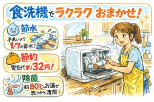 また80℃のすすぎ洗いで洗い上がりが綺麗!!しっかり、除菌も忘れず手洗いより節水!!👀✨